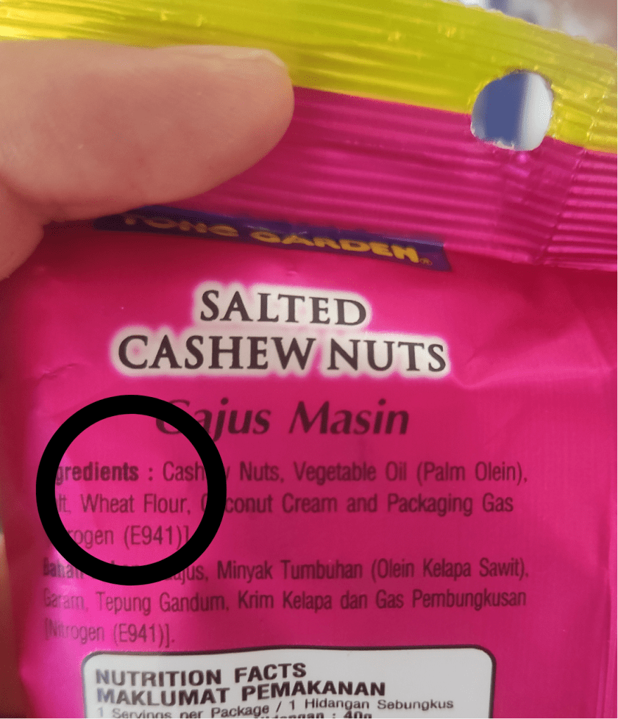 OJO col los aditivos: En Malasia no tienen leyes que aclaren la obligatoriedad de poner alérgenos en los envases de los productos alimentarios y muchas veces tendrás la duda de poder comer algo envasado o no. Yo la verdad es que no me fie demasiado de nada, ni aunque pusiera que estaba hecho con harina de arroz. Pero si sois de los que os fiais del etiquetado en el Sudeste asiático hay algunos aditivos que en Europa no llevan gluten que en estos países si que lo suelen llevar y no lo indican en alérgenos, como los siguientes: Maltodextrine, tarch, vitamin c powder, caramel color.