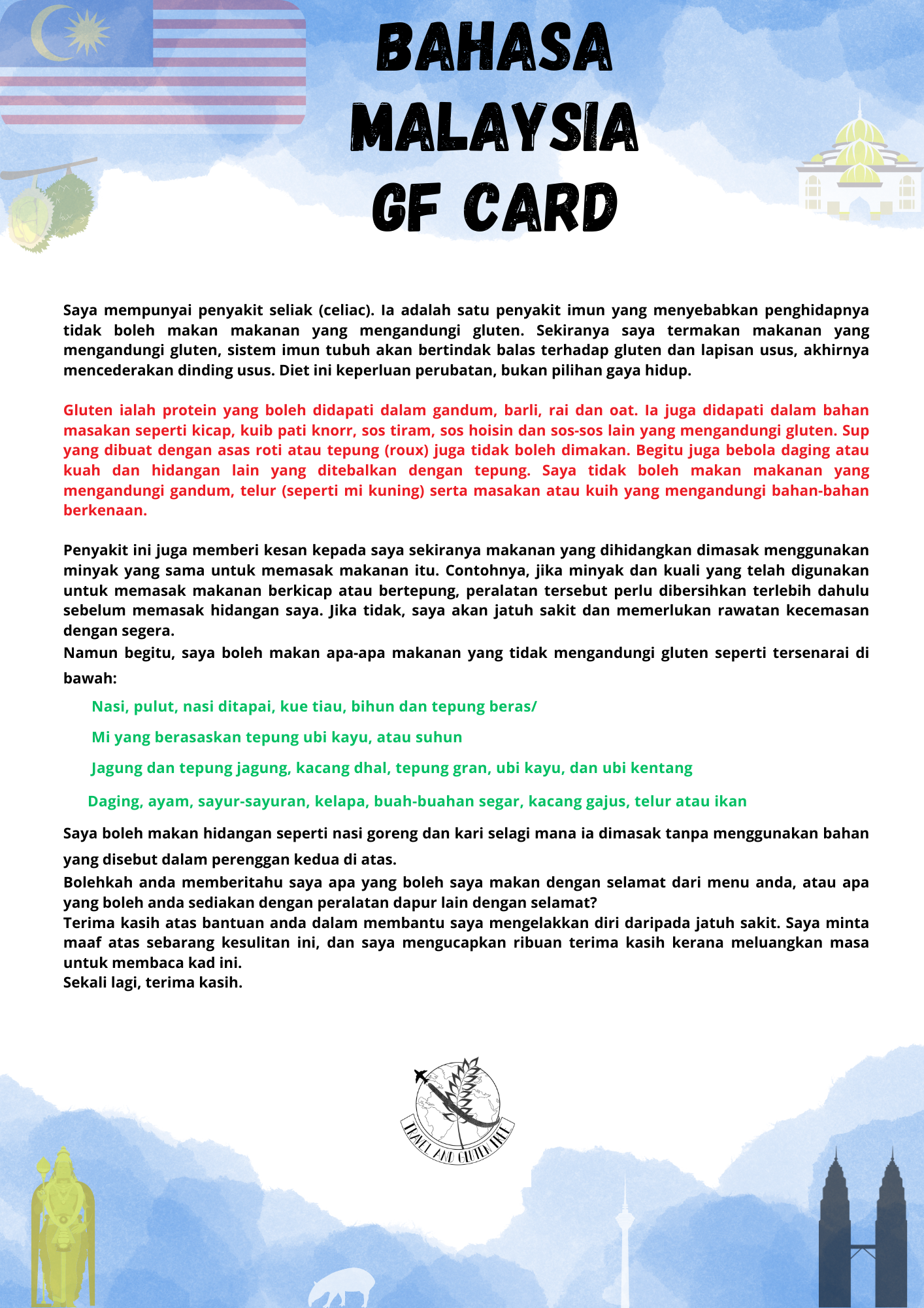 En esta Guía de Viaje por Malasia encontrareis un listado de los alimentos y comidas que no contienen gluten y otro con las comidas típicas que sí que lo contienen. También proporciono información de los principales puntos turísticos del país y los mejores restaurantes donde encontrar opciones sin gluten en cada uno de ellos.