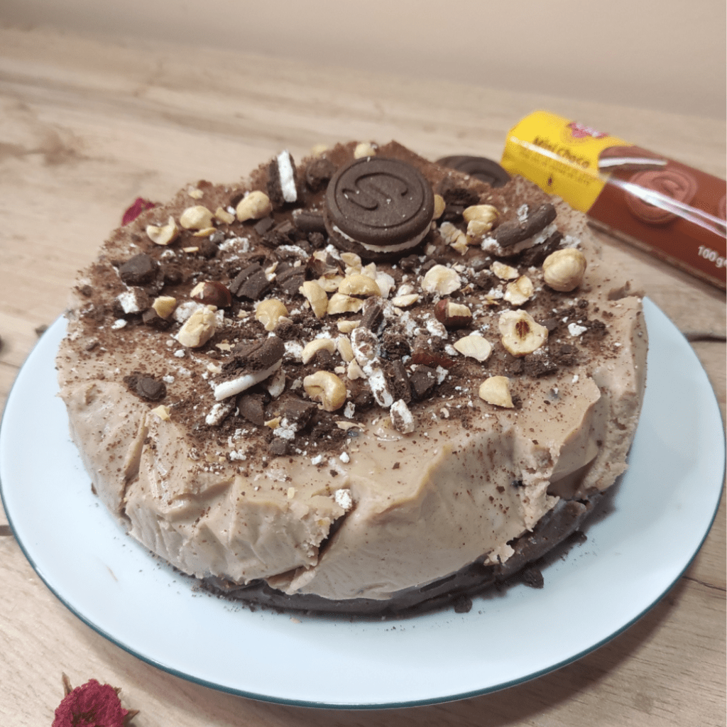 Finalmente, desmoldamos el pastel y lo decoramos a nuestro gusto con cacao en polvo, avellanas molidas y enteras, y galletas Schär. ¡Es el toque final perfecto para esta tentación culinaria!