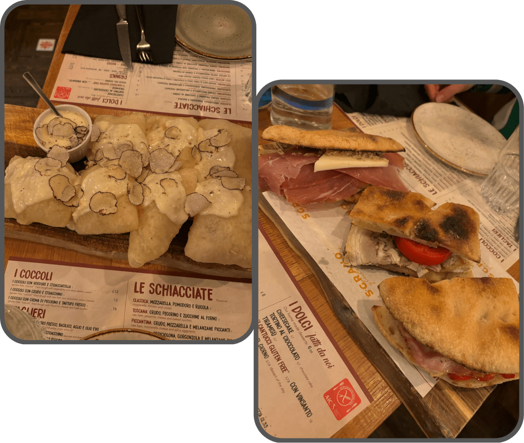 Sgrano – A must-visit for a gluten-free trip to Florence. This restaurant offers a 100% safe dining experience with high-quality ingredients. One of their signature dishes includes fried triangular bread served with truffle sauce, which is absolutely delicious. They also serve crispy, flaky sandwiches with a delicate, melt-in-your-mouth texture. A truly delightful experience! 🤤