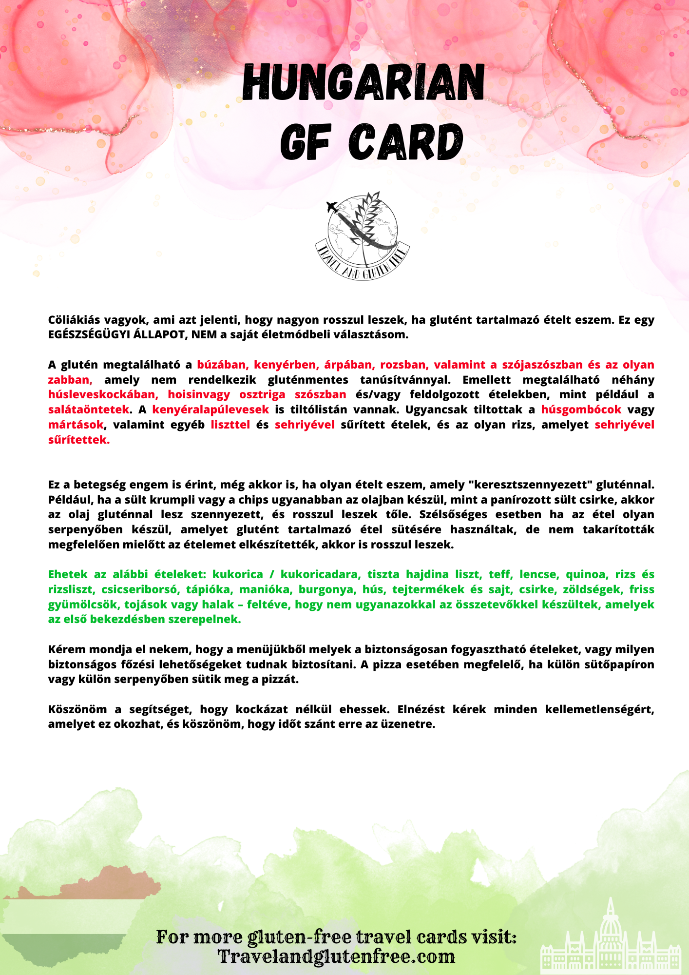 If you’re planning to travel beyond Budapest, it’s highly recommended to print a gluten-free travel card in Hungarian. This card explains: